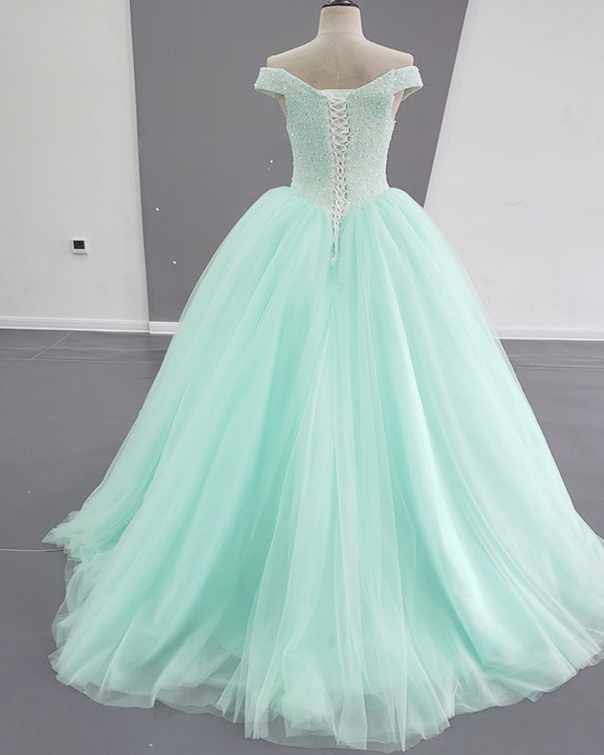 Mint Tulle Beaded Long V Neck Puffy Prom Dress, Quinceanera Dress