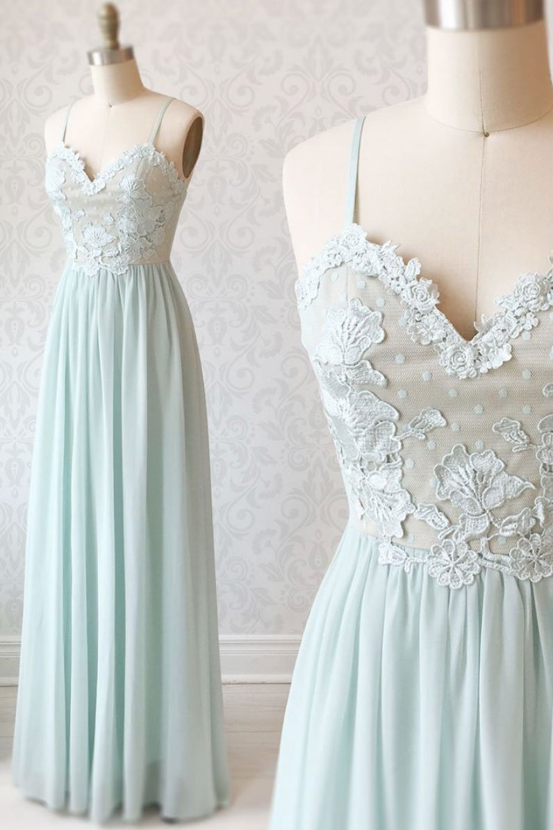 Light Mint Chiffon Simple Spaghetti Straps Prom Dress, Bridesmaid Dress With Applique