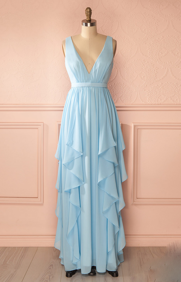 Simple Baby Blue Chiffon Long V Neck Prom Dress, Unique Evening Dress, Blue Bridesmaid Dresses