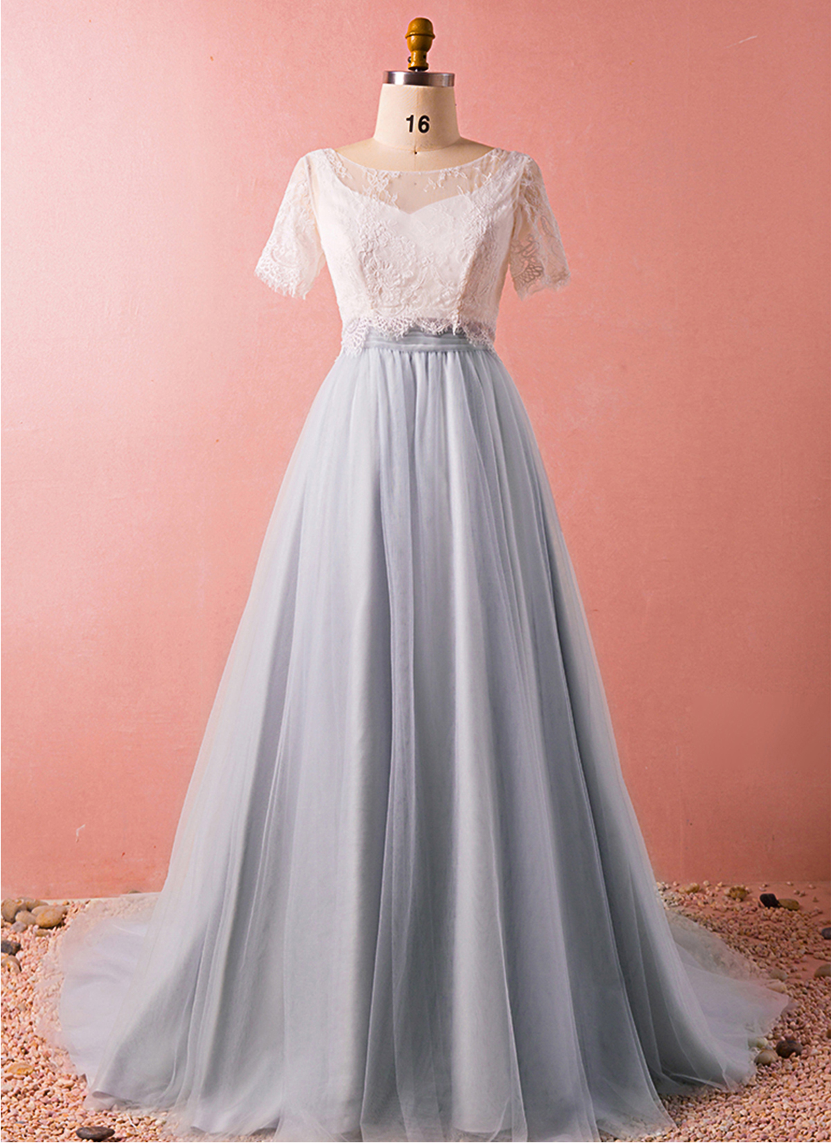 White Lace Short Sleeve Long Gray Tulle Evening Dress, Formal Dress, Junior Bridesmaid Dresses