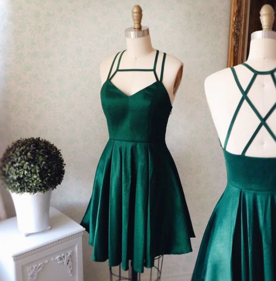 Forest Green Satin Plunge V Strappy Short Ruffled Skater Homecoming Dress Featuring Open Back