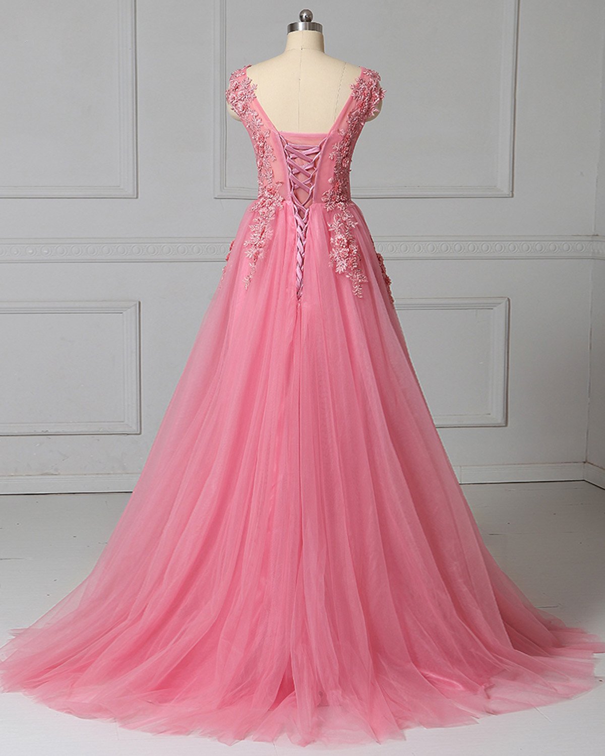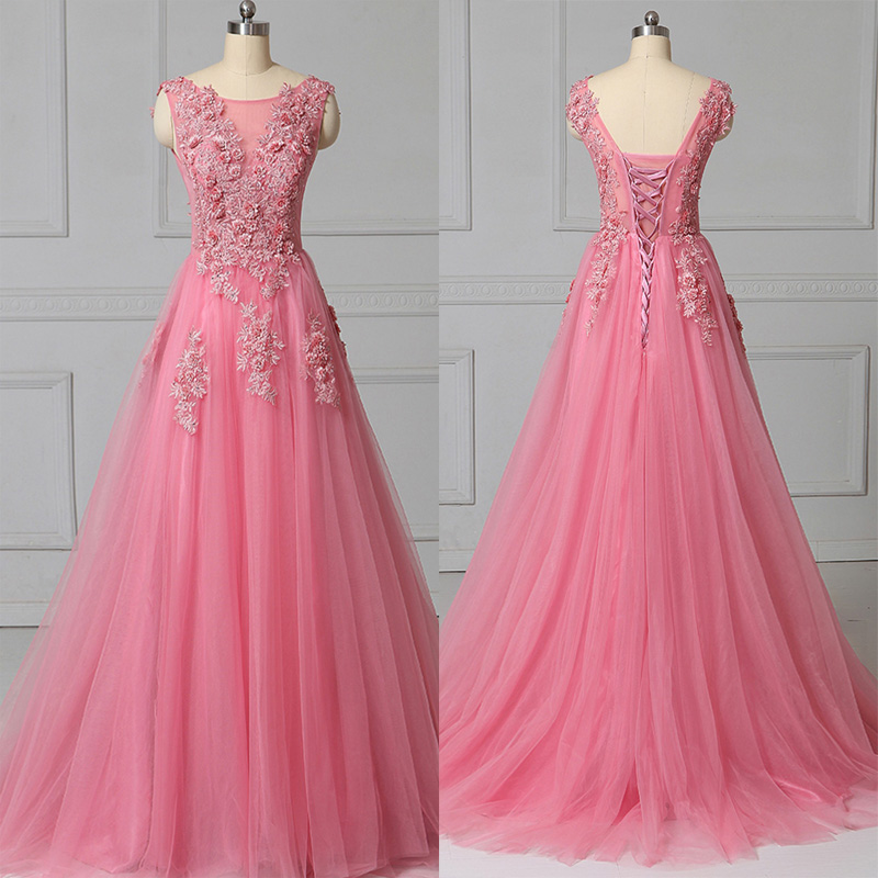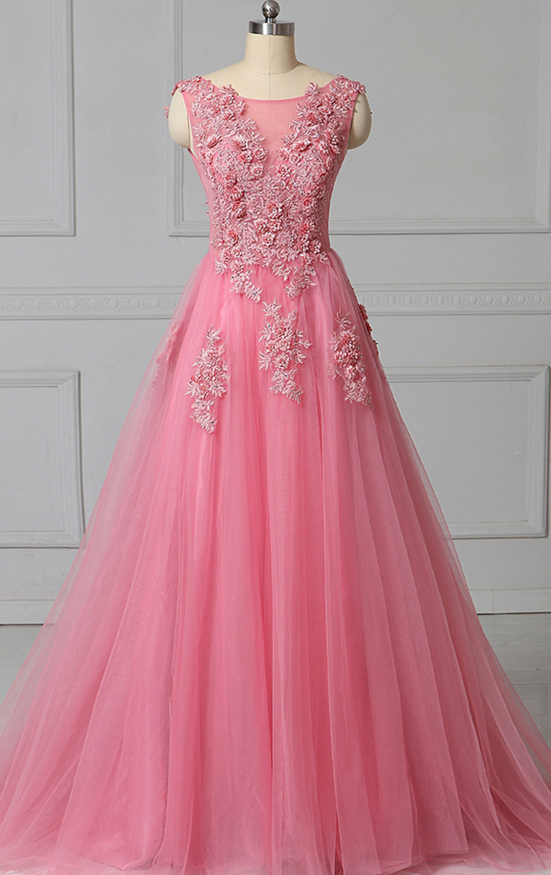 Unique Pink Tulle Scoop Neck 3D Lace Applique Evening Dress, Prom Dress