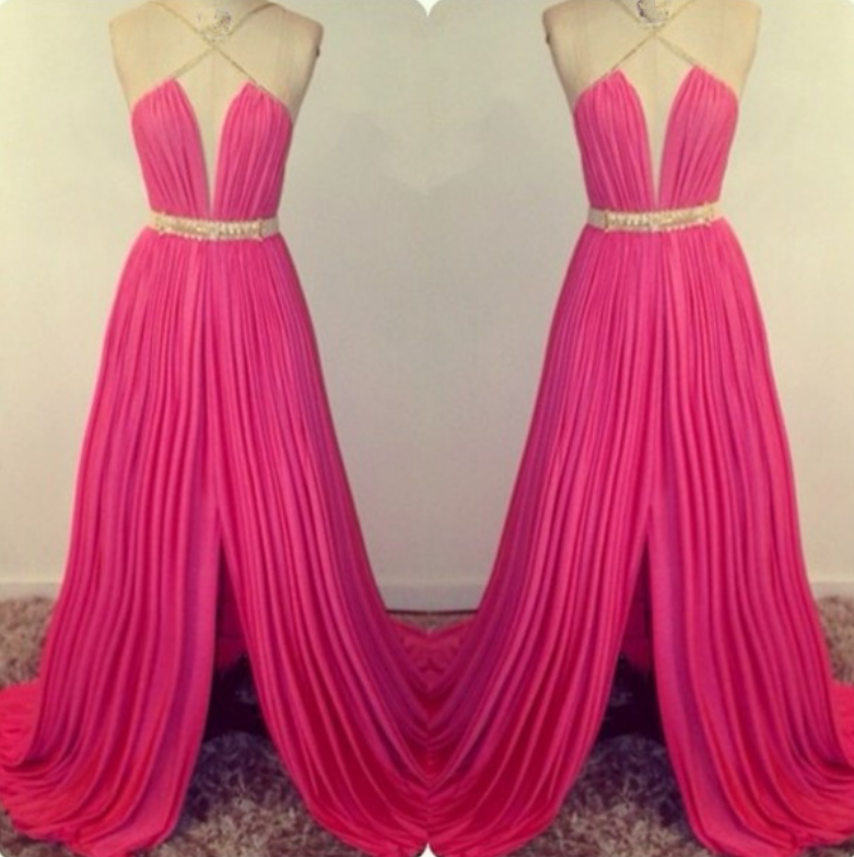 Hot Pink Prom Dresses,Backless Prom Dresses,Slit Evening Gowns,Split Formal Gown,Fuchsia Bridesmaid Dresses