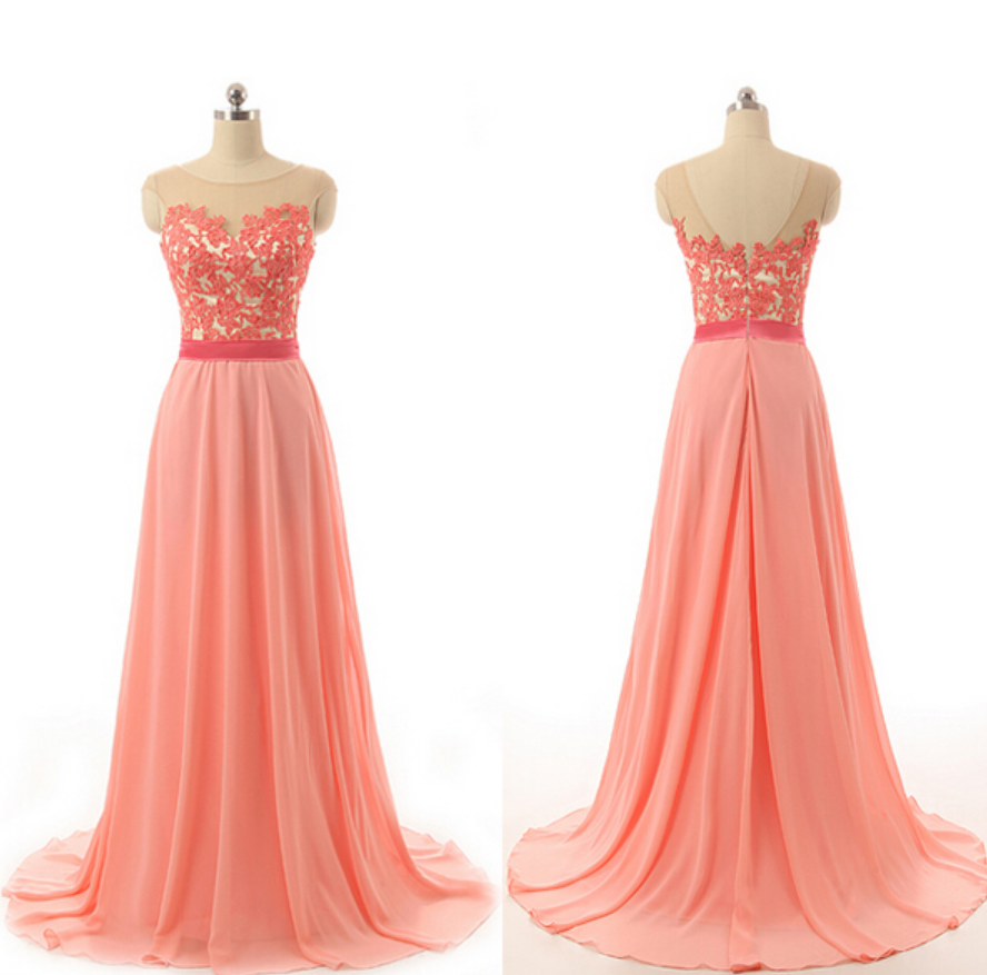 Coral Bridesmaid Dresses,Lace Prom Dress,V-back Graduation Dress,Illusion Lace Evening Dress,A-line Occasion Dress