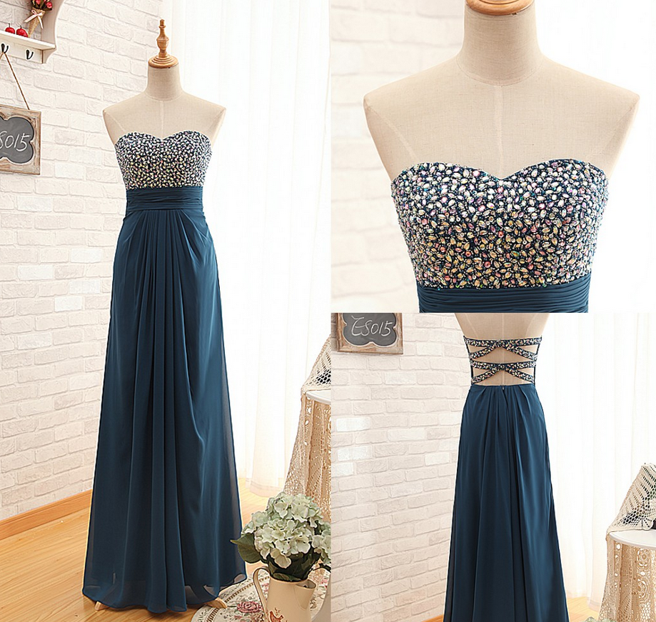 Navy Bridesmaid Dresses, Empire Beaded prom Dress,Long A-line Chiffon Graduation Dress,Sexy Open Back Formal Party Dress