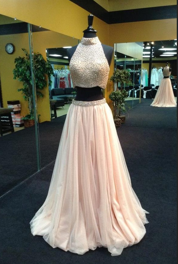 High Neck Prom Dress,Two Pieces Beaded Blush Prom Dress,Blush Tulle Two Pieces Prom Gown,High Neck Party Dress