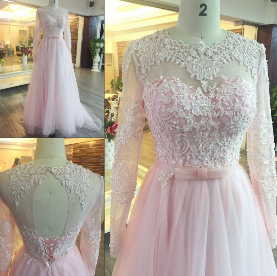 Long Sleeve Bridesmaid Dresses, Charming Prom Dress,Elegant Prom Dress,Pink Appliques Long Sleeve Prom Dresses,Long Evening Dress,Formal Dress