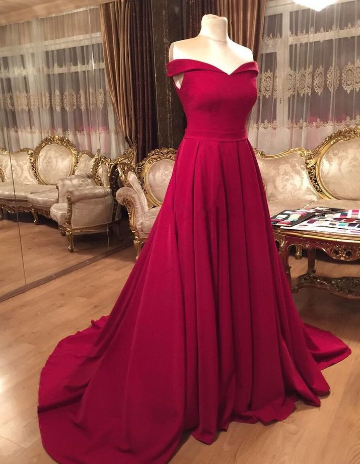 Off the Shoulder Satin Formal Dresses,Sweep Train Evening Dresses Long,Evening Party Dresses,Burgundy Prom Dresses,Formal Gowns