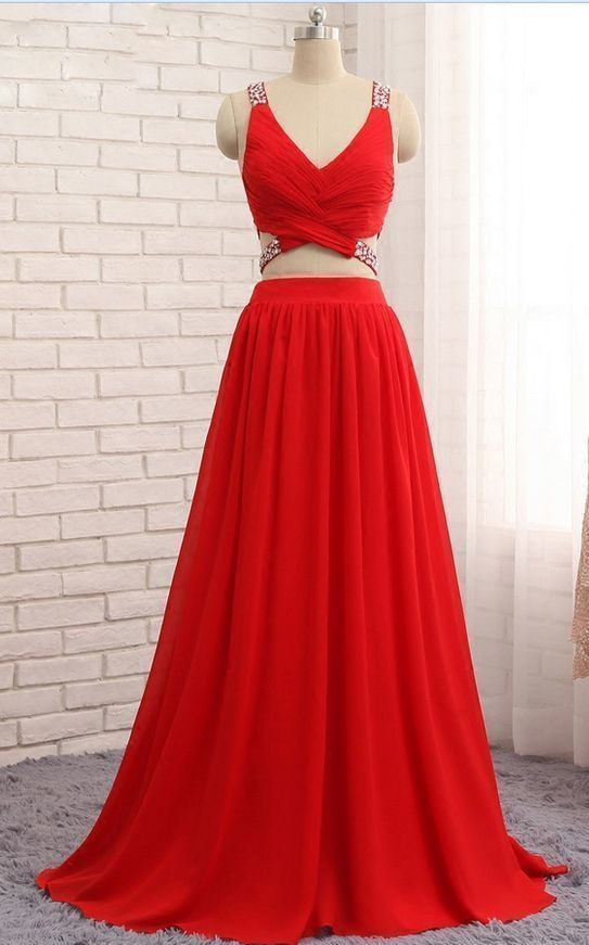 Custom Made Sexy Two Pieces Chiffon Beads Red Dresses, Sexy V Neck A Line Sleeveless Long Prom Gowns, Red Bridesmaid Dresses, Wedding Guest Dresses