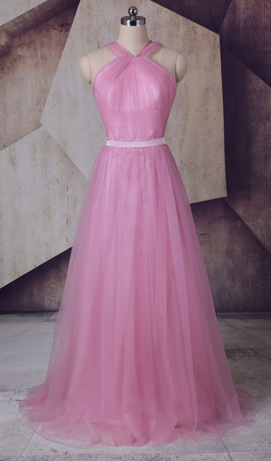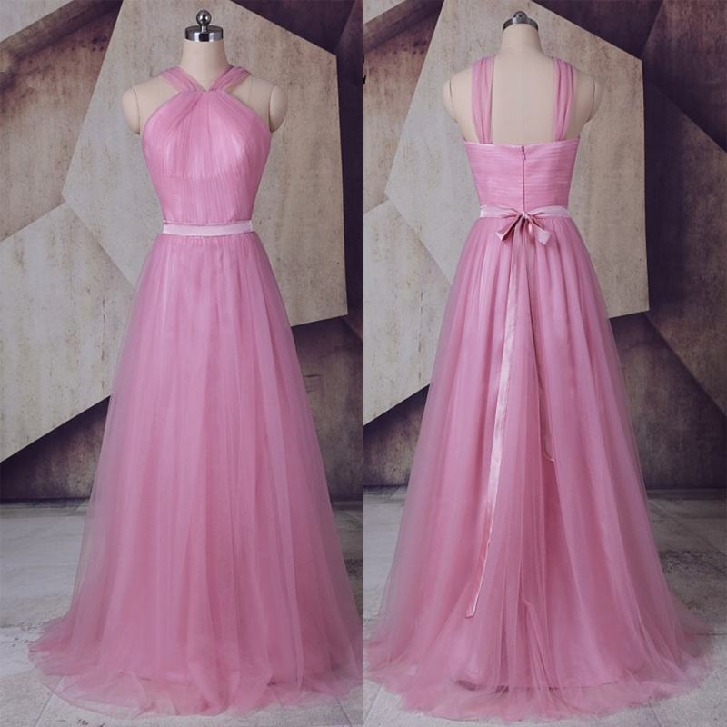 Pink Bridesmaid Dresses, Rose Pink Cross Halter Neck Long Tulle Prom Dress, Evening Dress