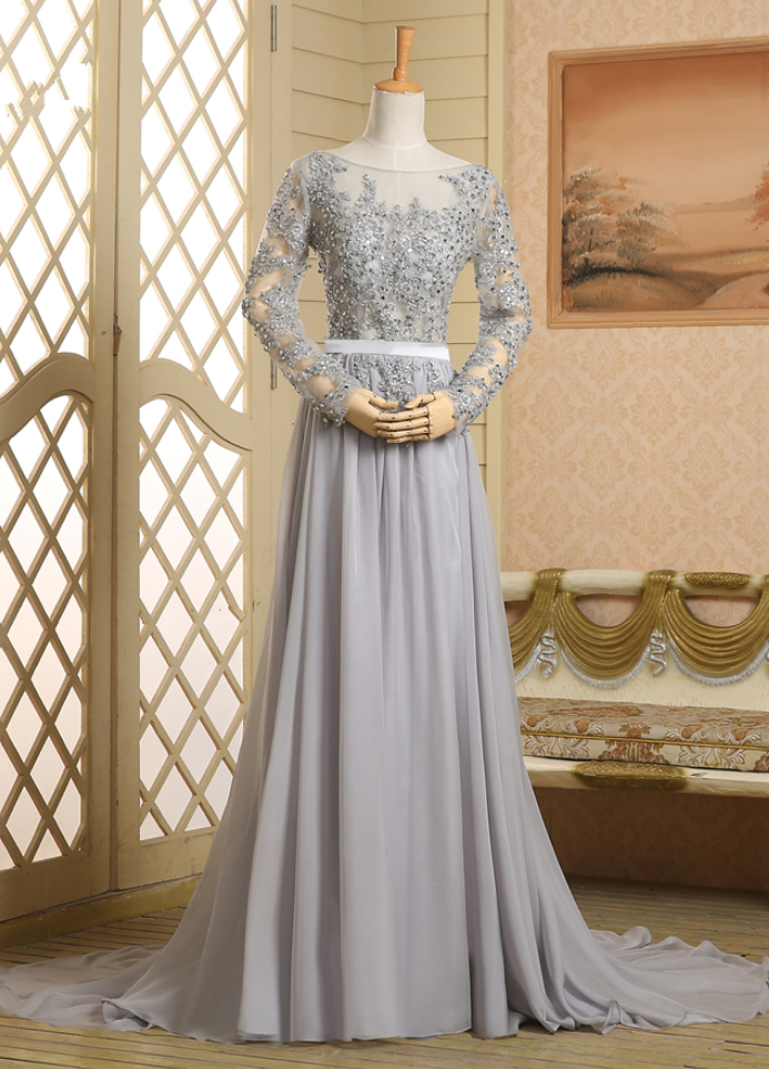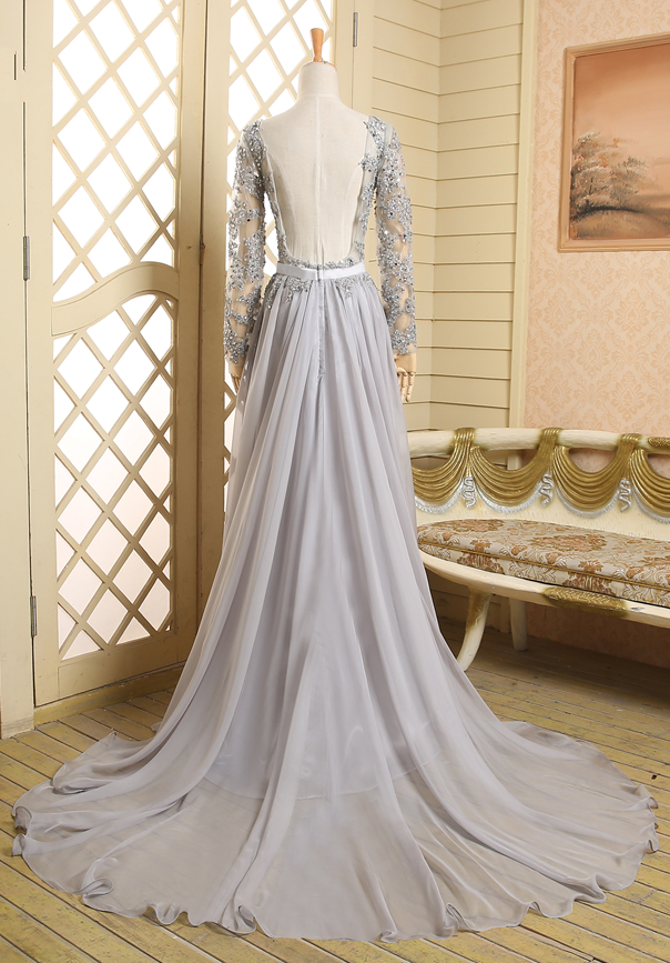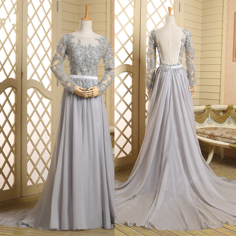 See Through Scoop Neckline Grey Chiffon Long Sleeves Hot Sale Prom Dress Applique Lace Open Back Evening Dresses