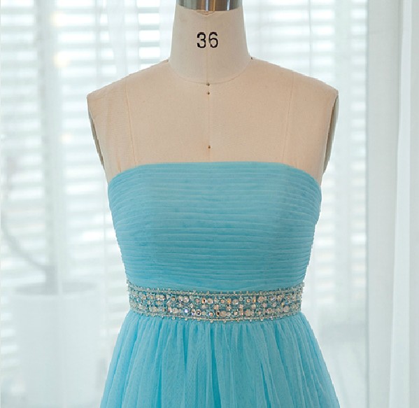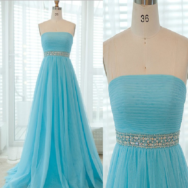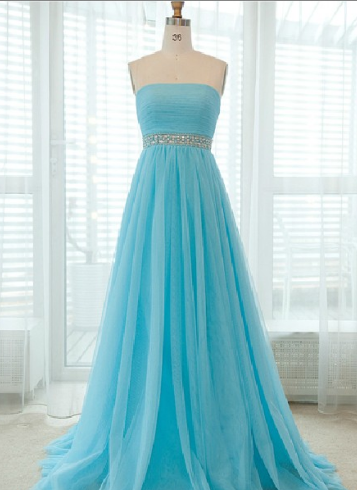 Blue Bridesmaid Dresses, Strapless A-line Tulle Prom Dresses Crystals Women Party Dresses, Long Prom Dresses