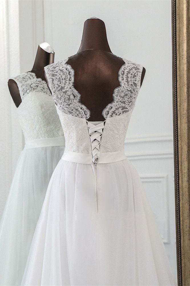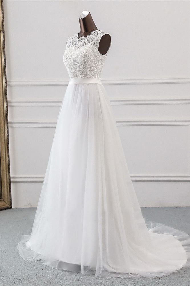Elegant Tull Lace Jewel Sleeveless White Wedding Dresses with Appliques Beach Bridal Gowns