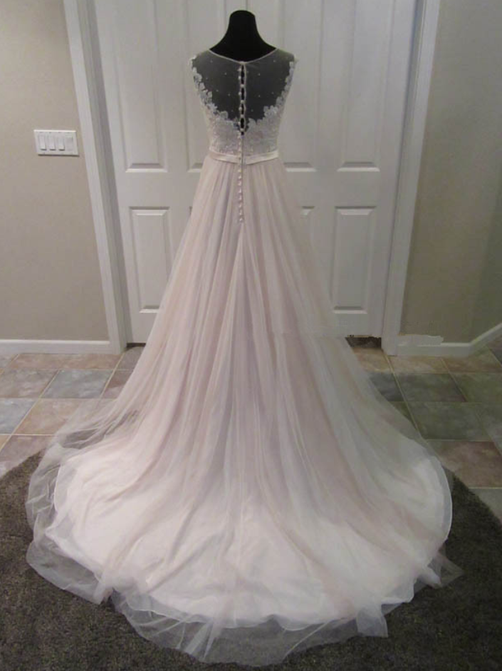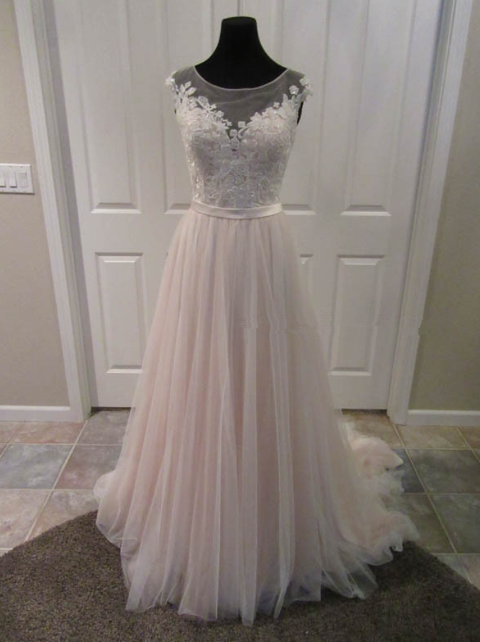 Blush A-Line Wedding Dresses with White Beaded Lace Appliques