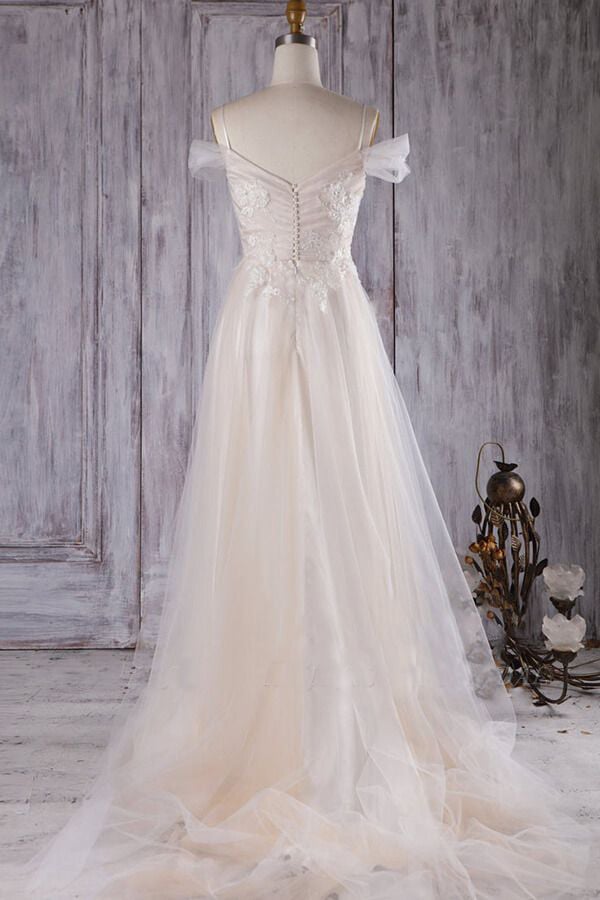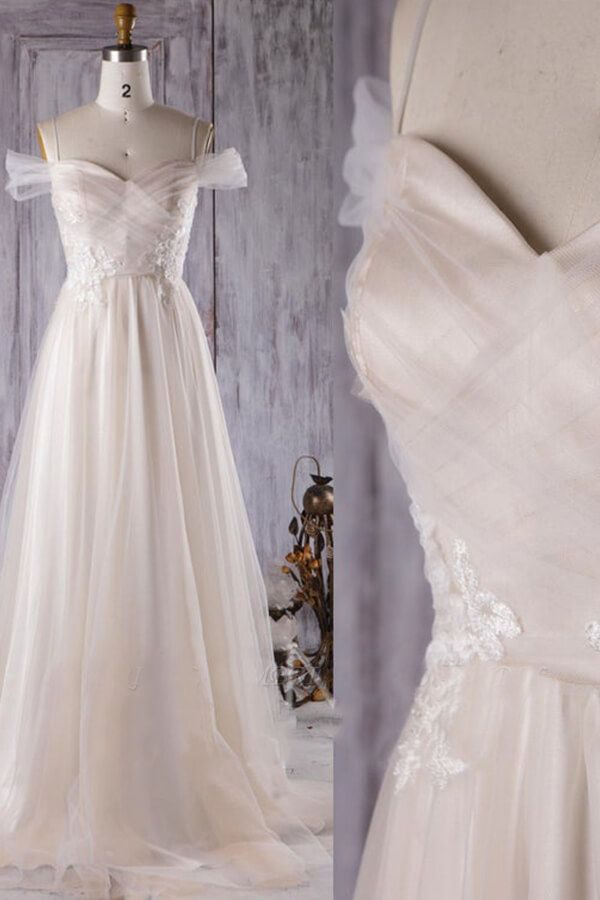 Off-the-shoulder A-Line White Champagne Tulle Wedding Dresses with Lace Appliques