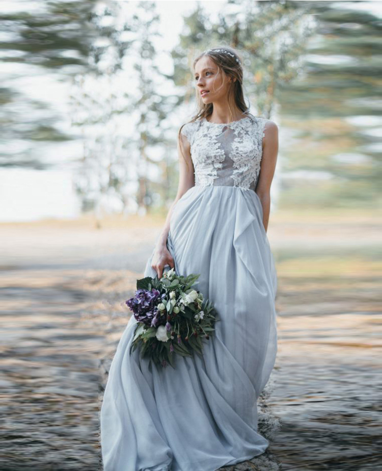 A-line Chiffon Modest Wedding Dresses with Ruffled Skirt Grey Bridal Gowns