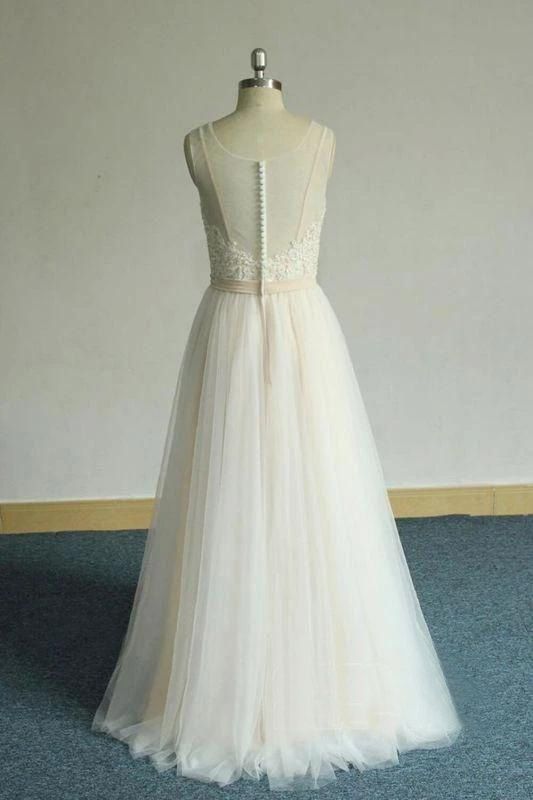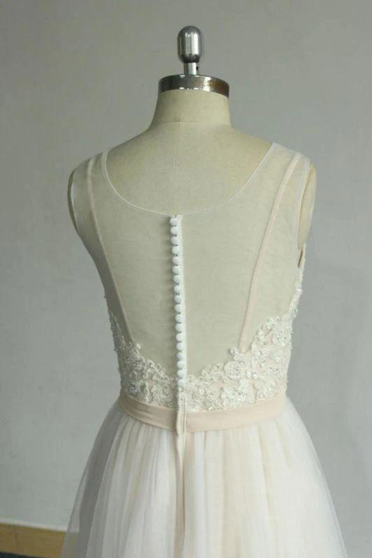 White Tulle Champagne Lining Boho Wedding Dresses with Lace Appliques