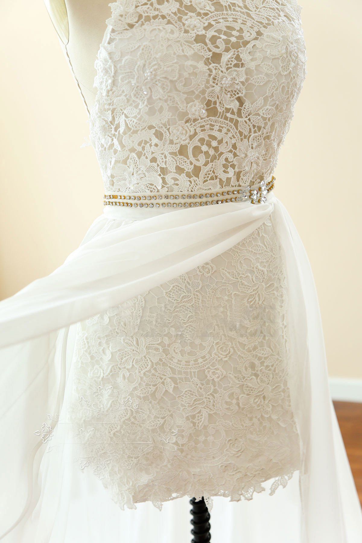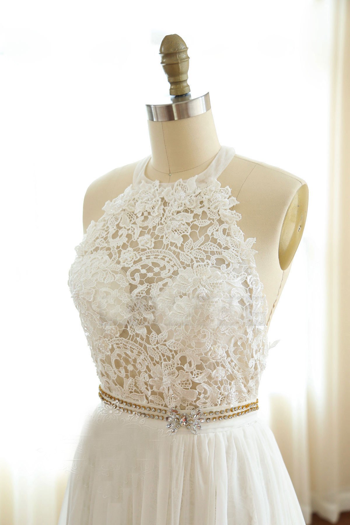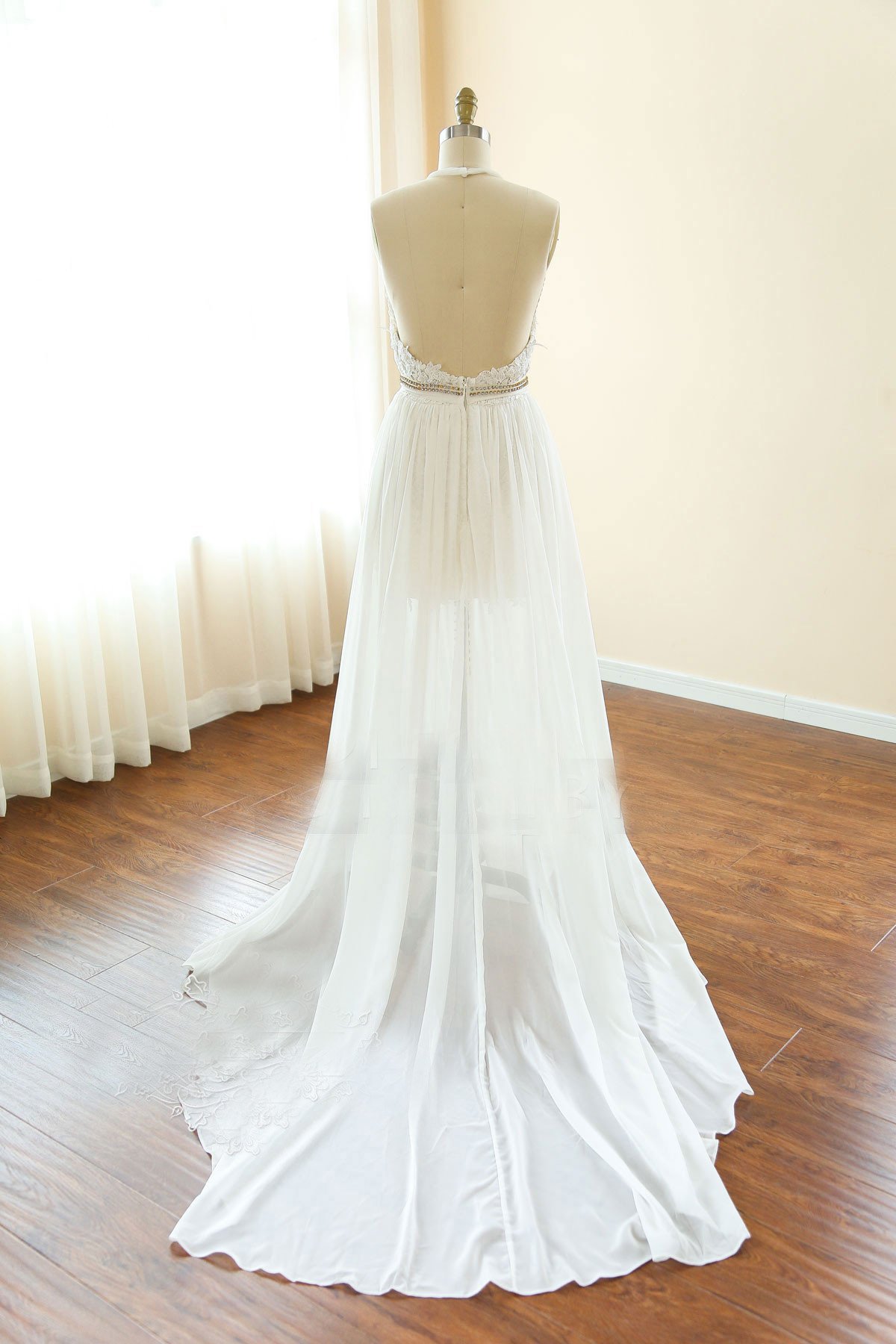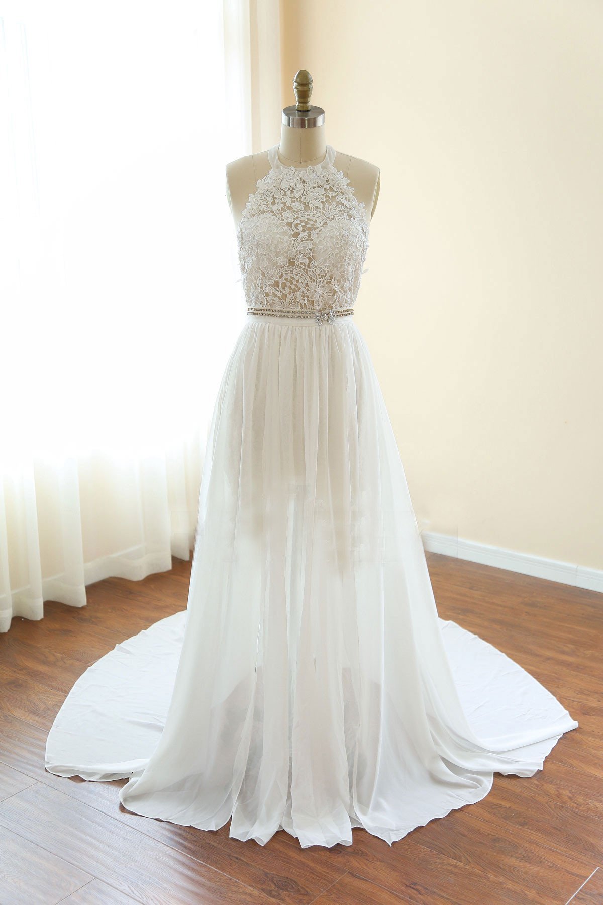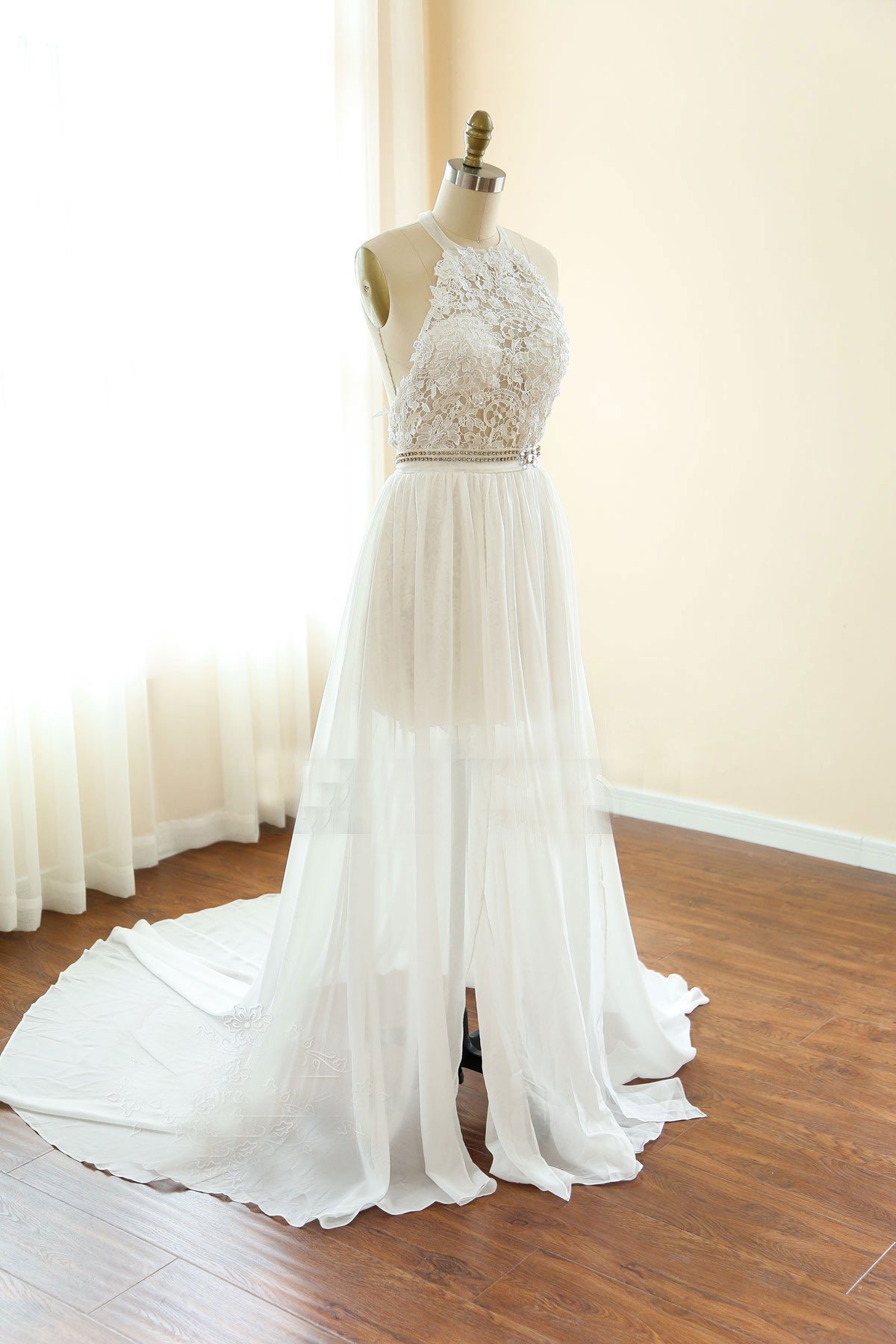 Halter A-line Lace Beach Wedding Dresses with Chiffon Skirt