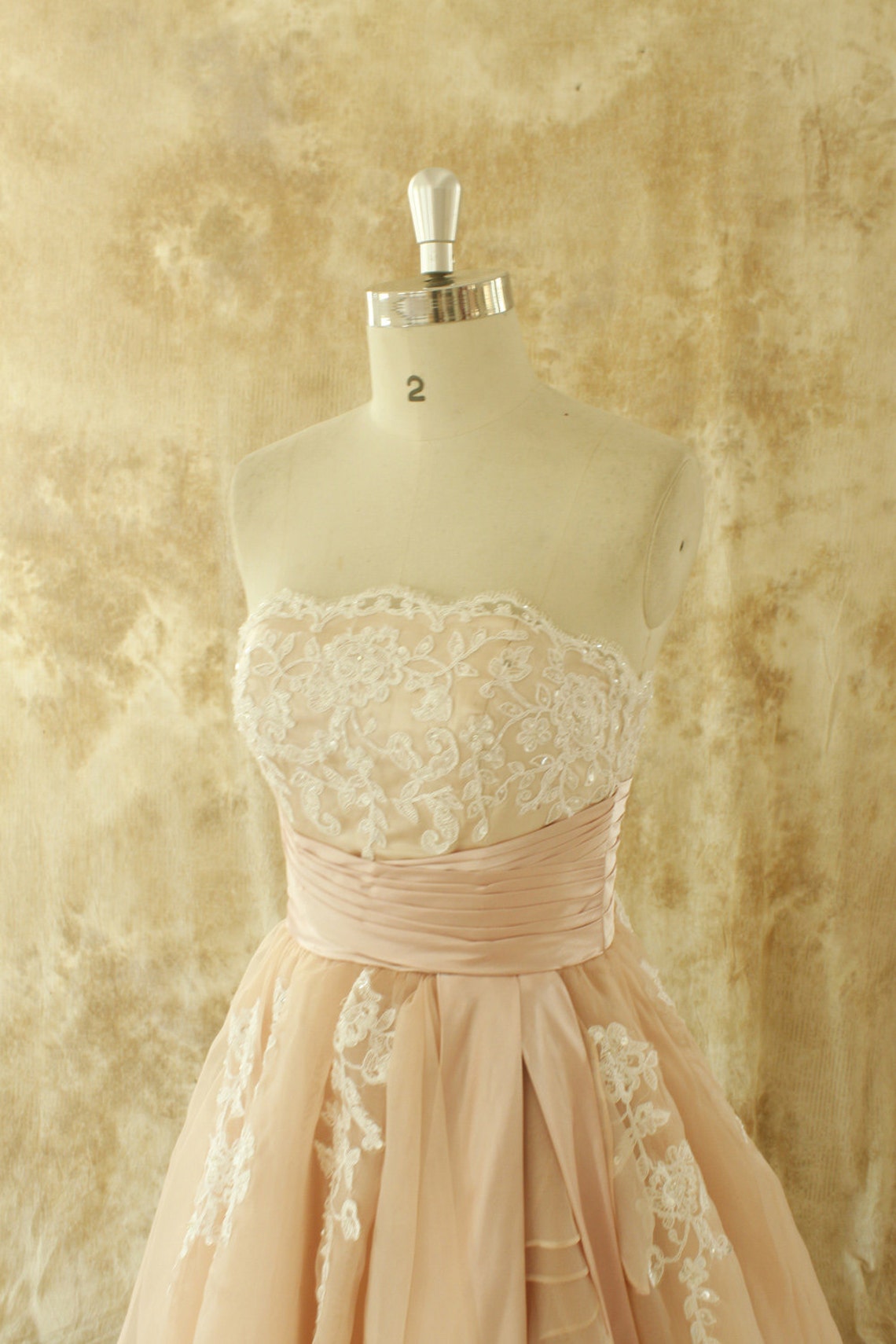 Champagne A-Line Organza Lace Wedding Dress with Beaded Appliques