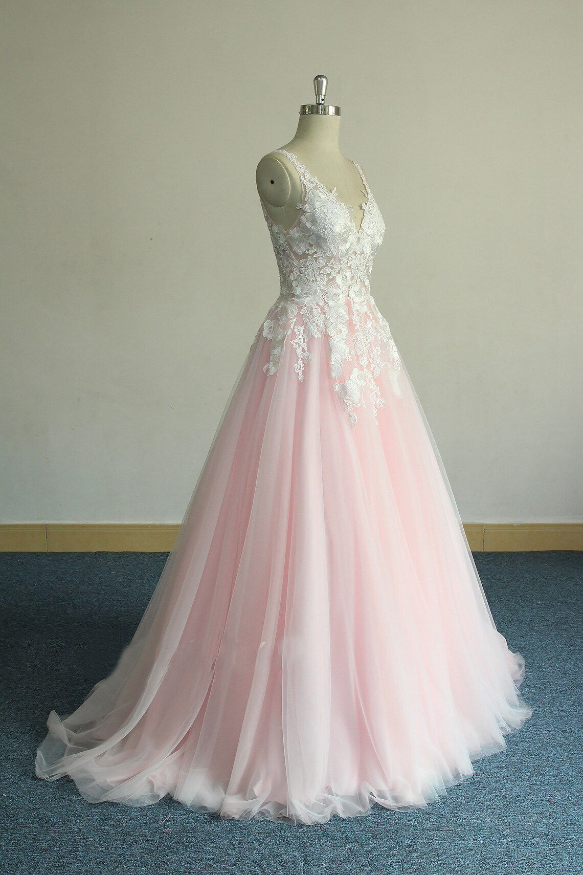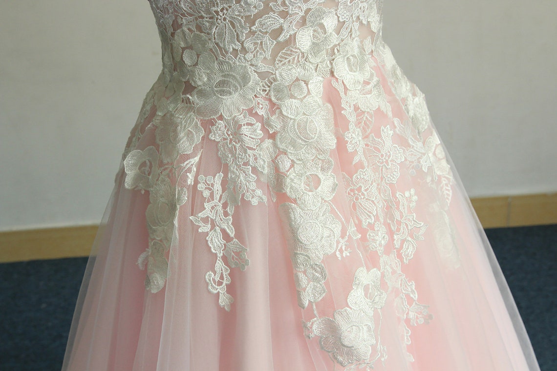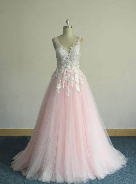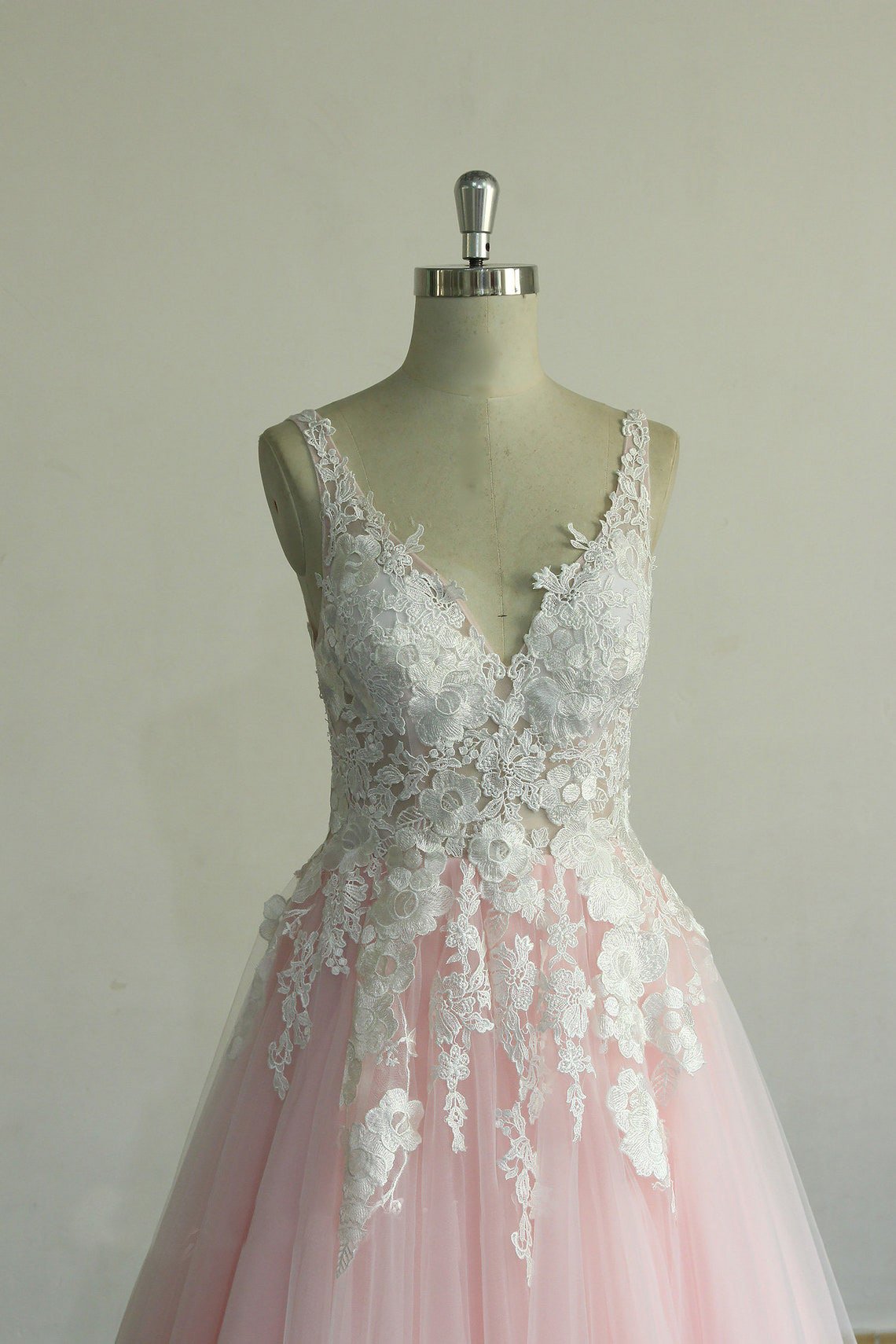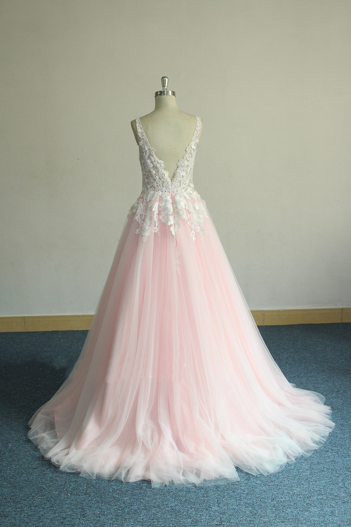 Unique Aline Deep V neckline Tulle Lace Wedding dress, Bohemian wedding dress, Light Pink Wedding Dress, Vintage Lace Wedding Dress