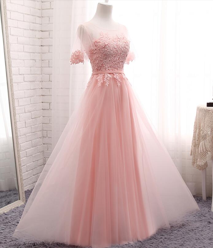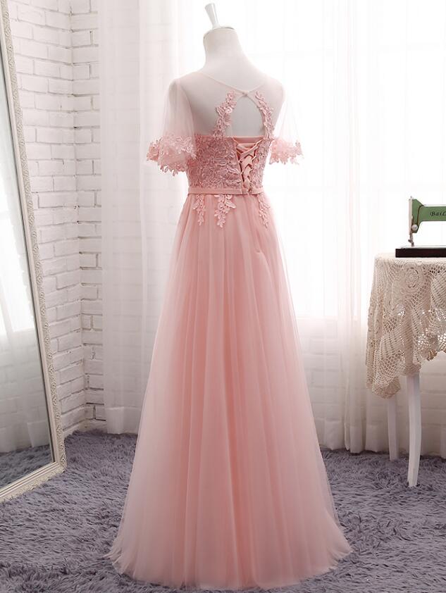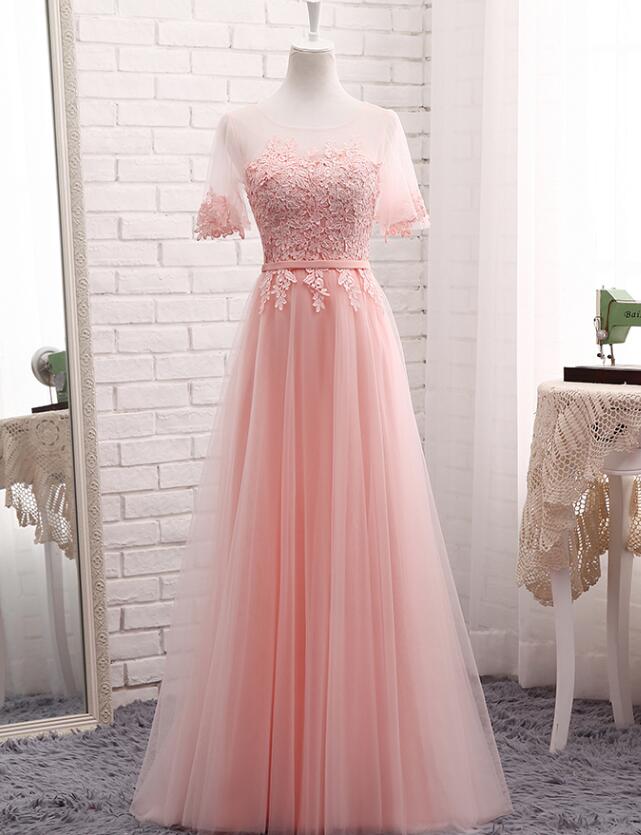 Pink Short Sleeves Bridesmaid Dresses, Pink Formal Dresses, Party Dresses, Evening Dresses, Long Pink Prom Dresses