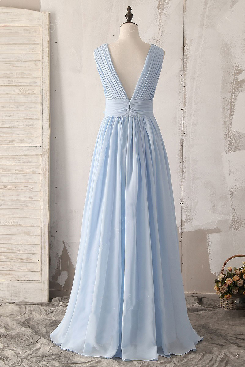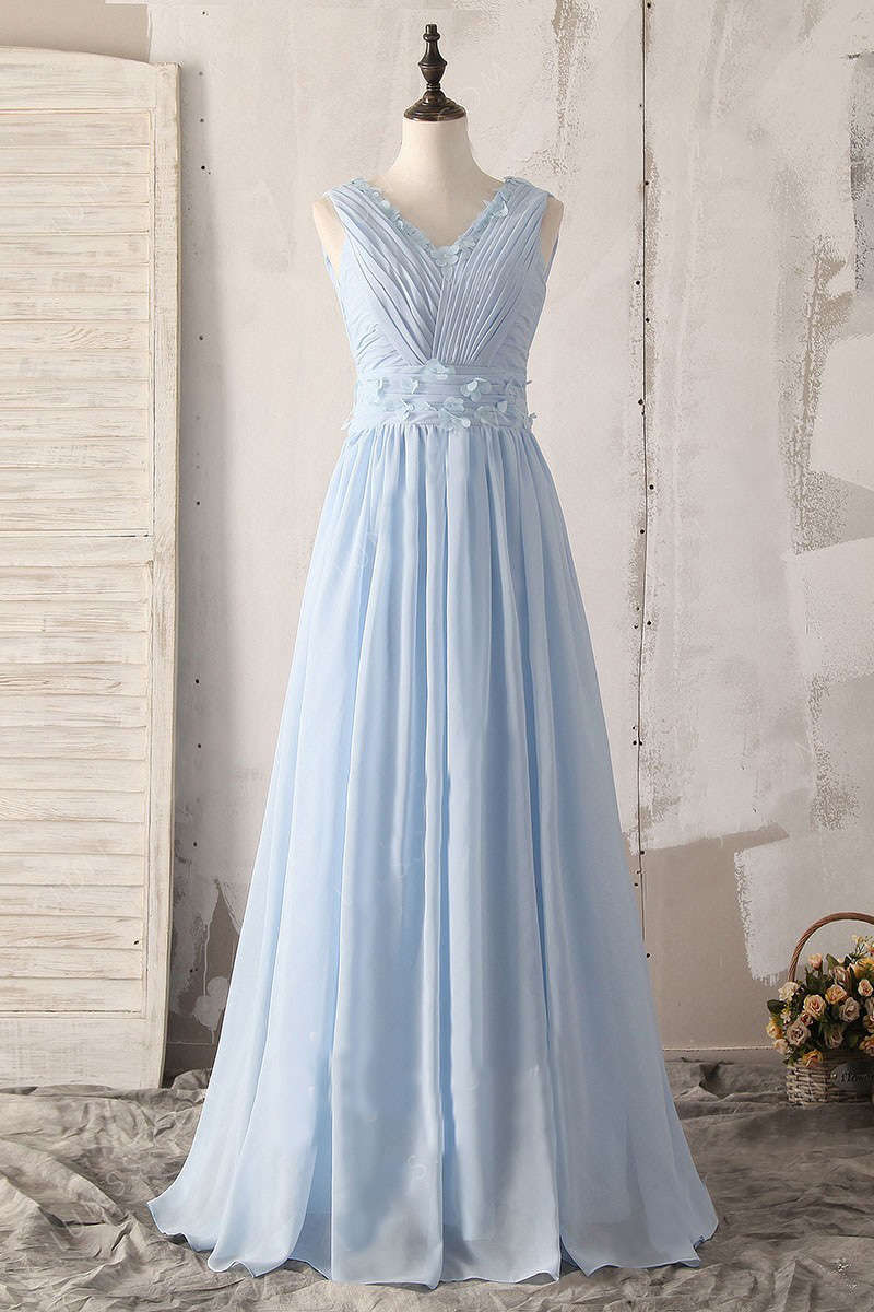 Chiffon Sleeveless Blue Prom Dresses with 3D Flowers, Long Evening Dresses