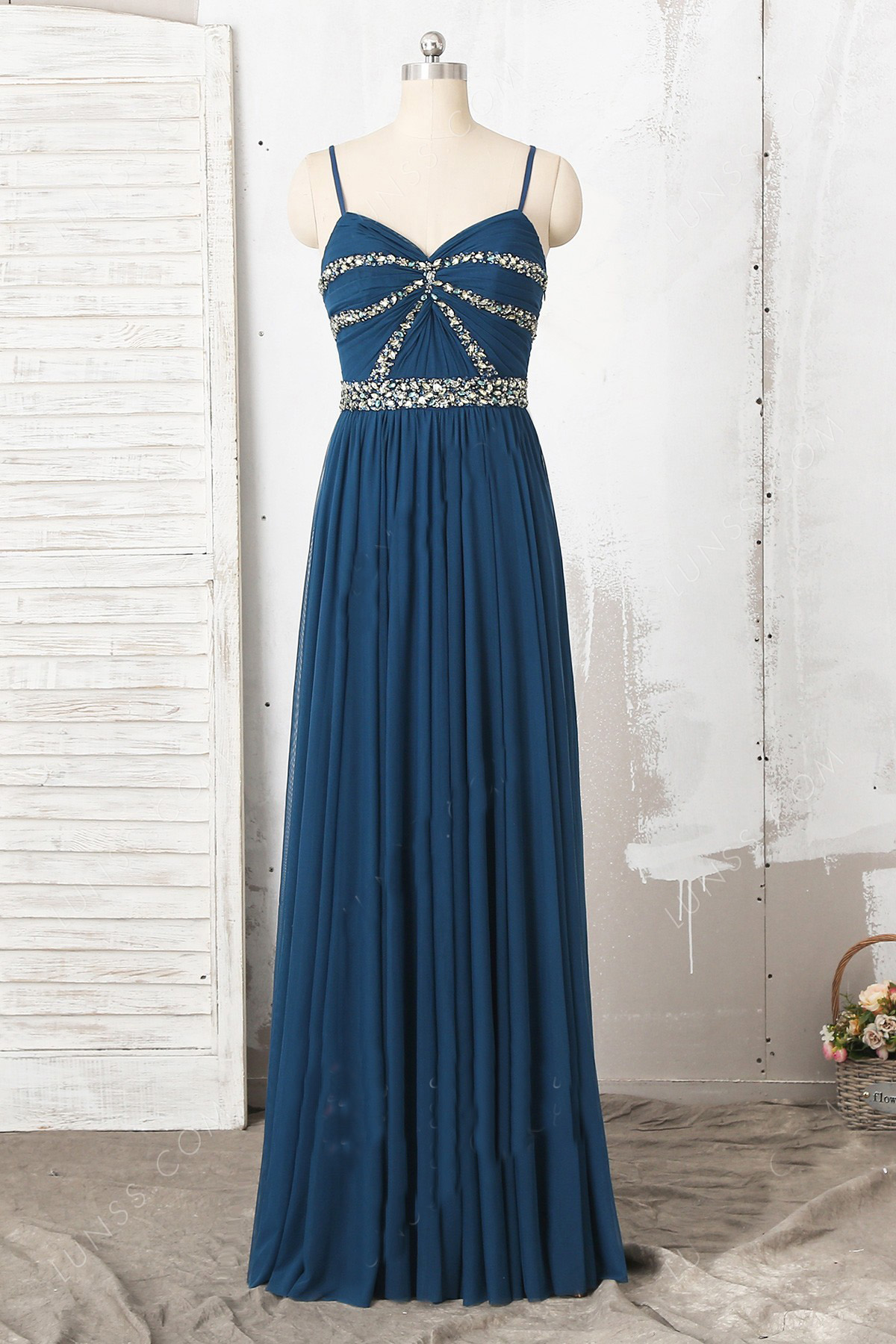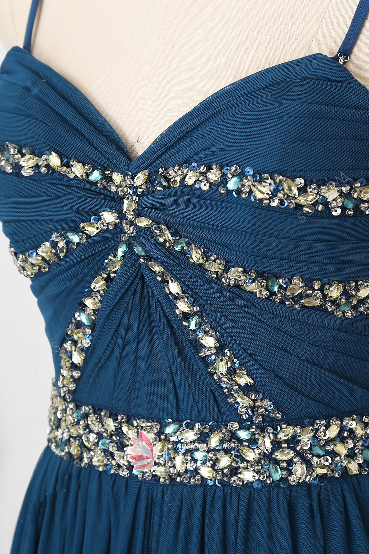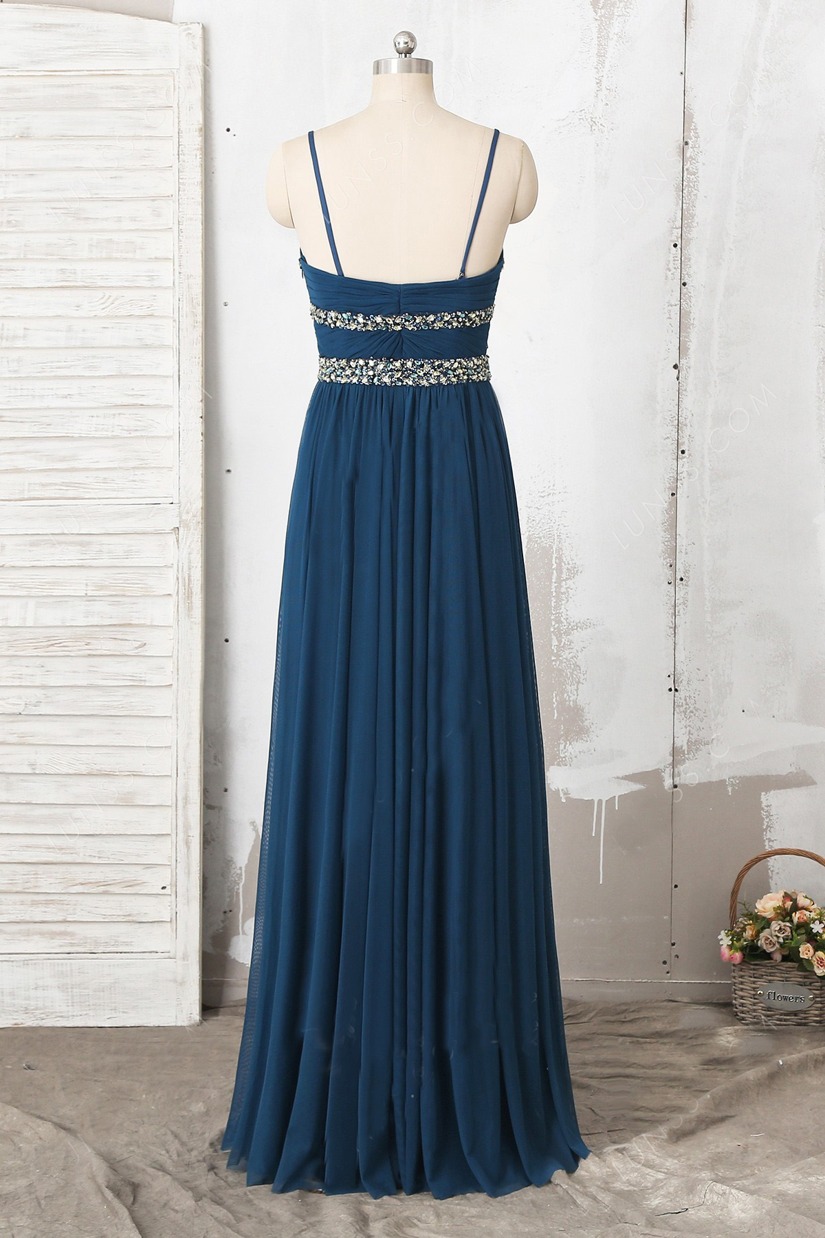 Spaghetti Tulle A-Line Navy Prom Dresses with Beading, Long Formal Dresses