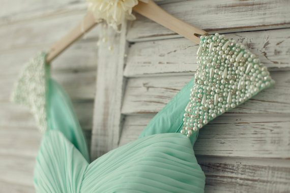 Mint Green Chiffon Long Bridesmaid Dress, Pearl Beaded Cap Sleeves Prom Dress, Maid of Honor Dresses