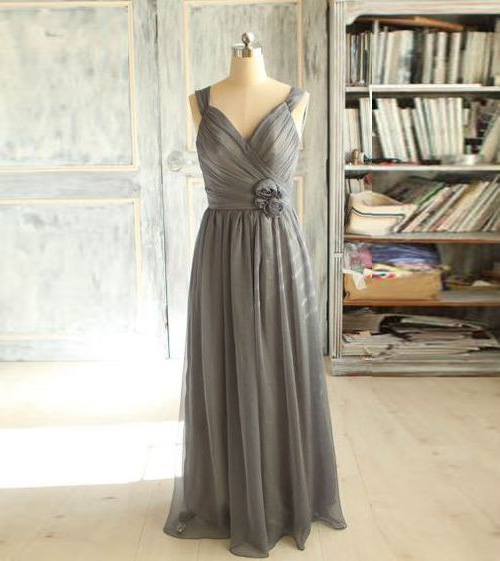 Chiffon Spaghetti A-Line Gray Bridesmaid Dresses with 3D Flowers