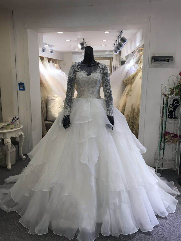 Long Sleeve Ball Gown Wedding Dresses with Beaded Lace Appliques