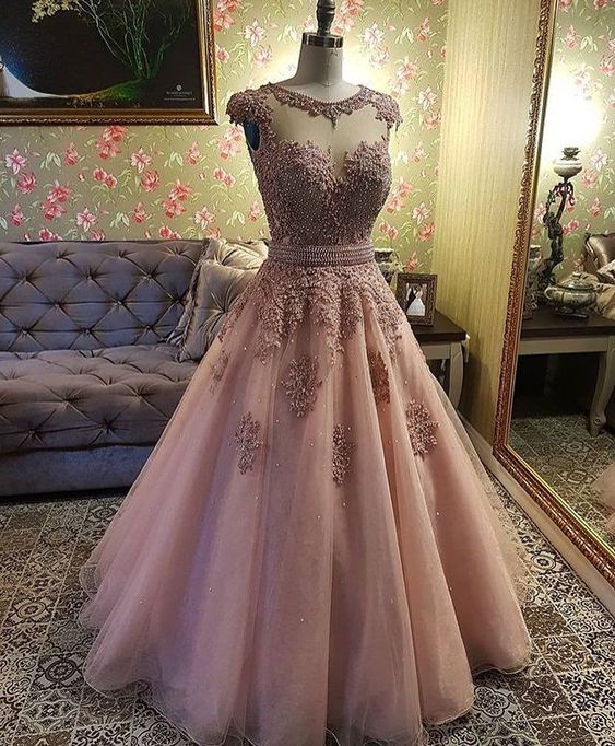 Dusty Pink Prom Dresses with Beaded Lace Appliques, Formal Dresses