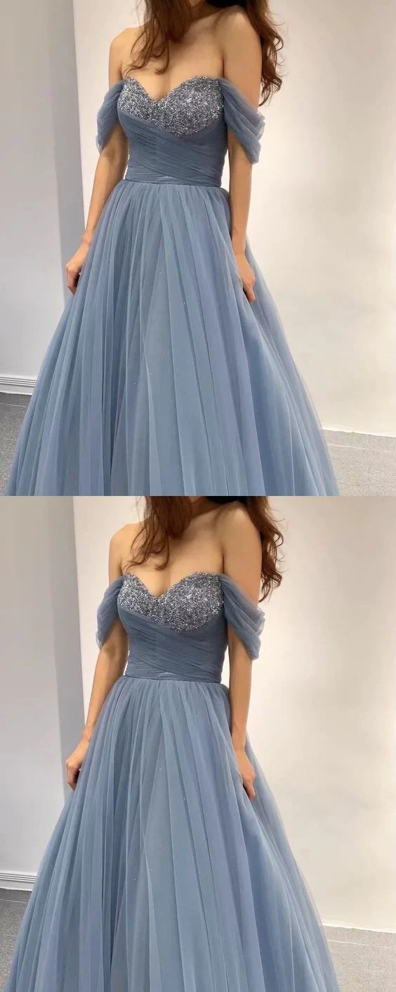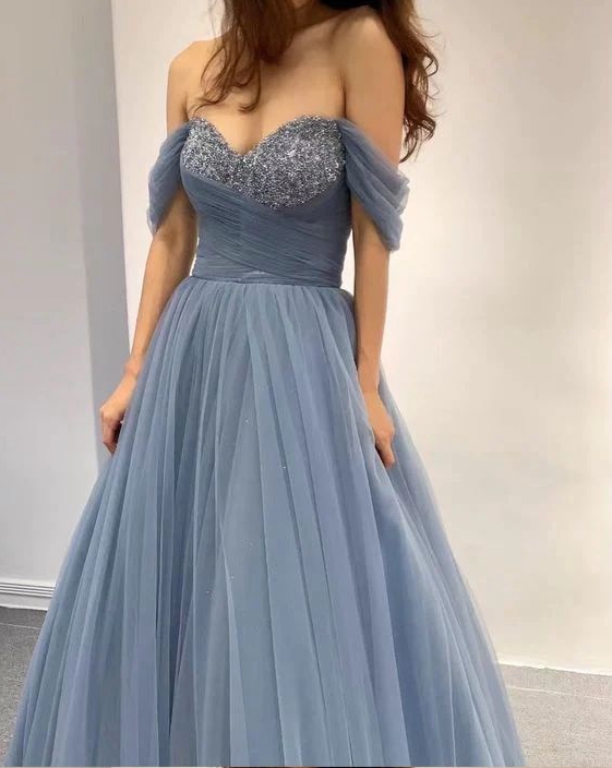 Off-the-shoulder Prom Dresses, Tulle Evening Dresses, Wedding Party Dress,Dusty Blue Princess Prom Dresses